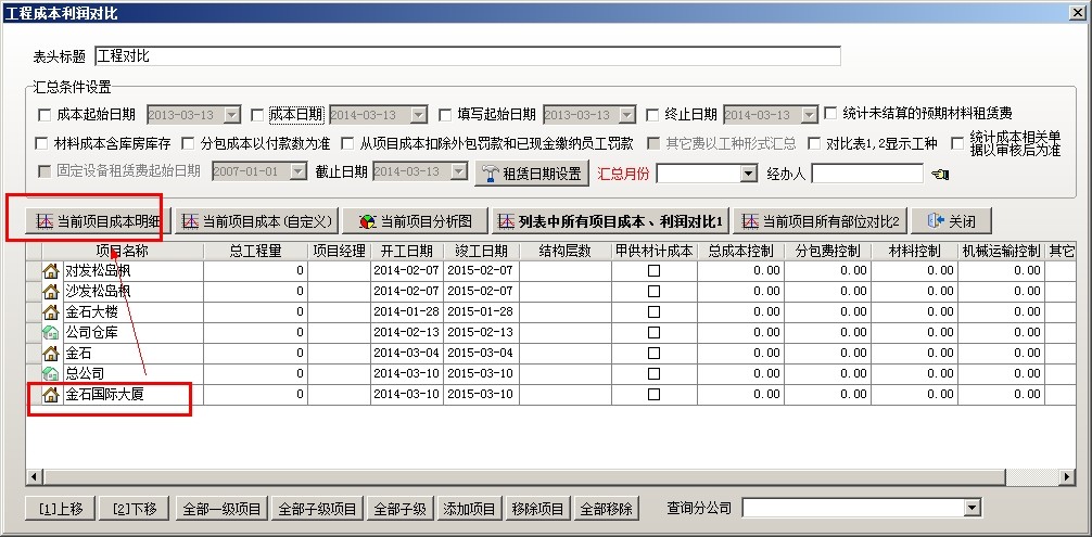 打開工程項目管理軟件項目成本利潤,選擇要查詢的項目,點擊當前項目成本明細(也可以在系統全局設置中自定義項目成本利潤表,在查看成本利潤的時候,選擇第二項,當前項目成本(自定義))