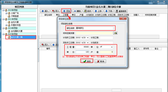 如下圖所示,在彈出的“項(xiàng)目部位分解及工程量清單設(shè)置”窗口中點(diǎn)“添加”按鈕,然后依次填寫(xiě)項(xiàng)目部位名稱、工程量、單位等相關(guān)信息,