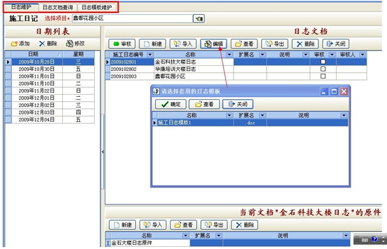 A添加施工日志:首先選擇項(xiàng)目名稱,在“日期列表”下點(diǎn)“添加”按鈕,選擇日期。然后在右側(cè)的“日志文檔”下新建一個日志文檔,然后選擇“編輯”按鈕,選擇一個“日志模板”建立日志文件可記錄工程項(xiàng)目施工進(jìn)度。也可以直接導(dǎo)入已寫好的現(xiàn)成日志文檔到軟件中,或者將 寫在日記本的日志用數(shù)碼相機(jī)或掃描儀做成圖片格式直接導(dǎo)入到軟件中。
