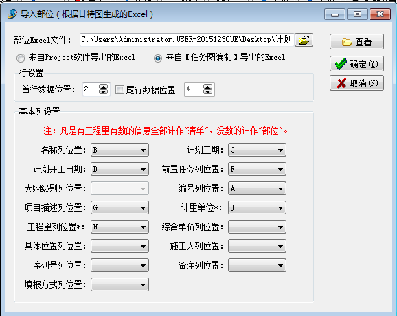上圖為來自project軟件導出的excel格式。在進度管理中導入時選擇好本地excel文件,設置好首行尾行數據位置,選擇好對應excel表中各列位置,即可選擇確定導入,如下圖: