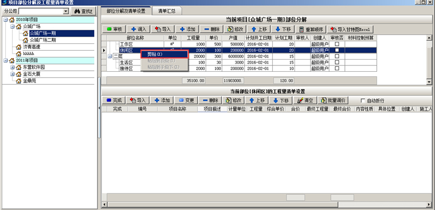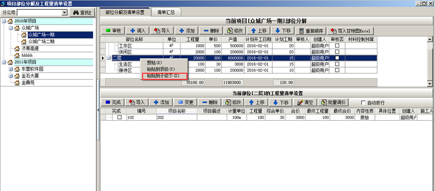 工程項(xiàng)目管理系統(tǒng)中已維護(hù)好的項(xiàng)目部位可進(jìn)行剪切粘貼的操作。“剪切”時(shí)選中要變動的部位,點(diǎn)擊鼠標(biāo)右鍵選擇“剪切”,“粘貼”時(shí)選中項(xiàng)目部位,點(diǎn)擊鼠標(biāo)右鍵,選擇“粘貼到頂級下”或“粘貼到子級下”,如圖: