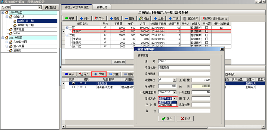 工程項(xiàng)目管理系統(tǒng)中部位分解完成之后,對項(xiàng)目做工程量清單設(shè)置。首先選中項(xiàng)目部位,然后在“工程量清單”里面點(diǎn)擊“添加”添加工程量清單,在編輯工程量清單時(shí),填寫各項(xiàng)基本信息。如圖: