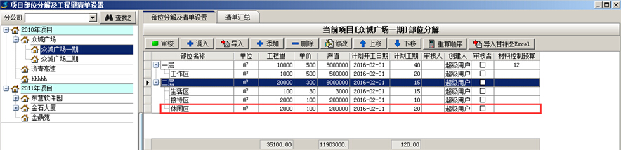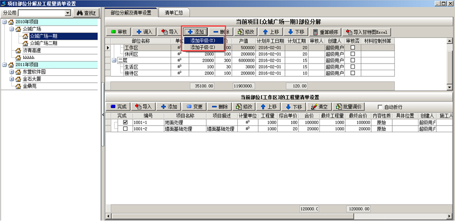 在《金石工程項(xiàng)目管理系統(tǒng)》中,進(jìn)行項(xiàng)目部位分解時(shí),可按照層次或級別進(jìn)行分解,即添加“平級”或“子級”。