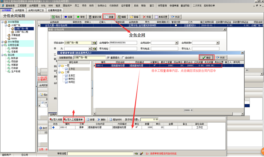 (1)選中對應(yīng)的分包合同點(diǎn)擊“新建”按鈕,把工程量清單導(dǎo)入合同中。如圖: