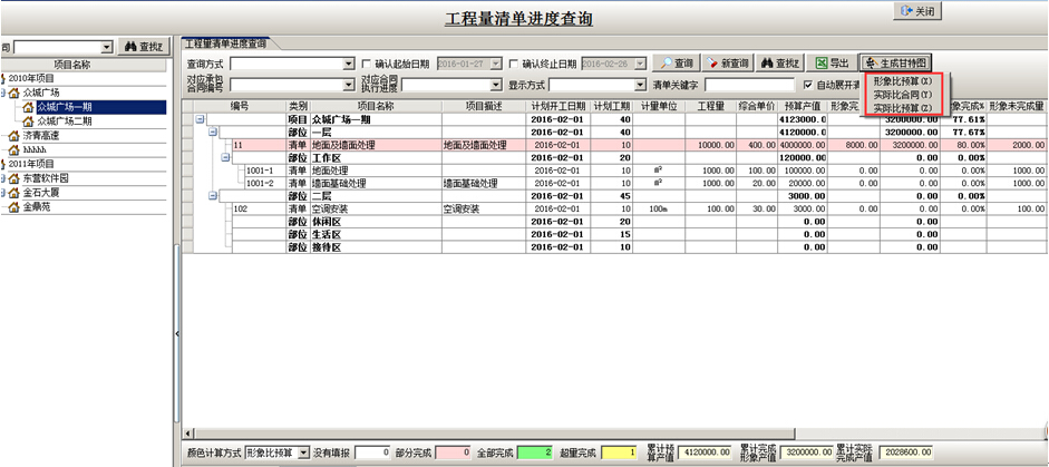 1、 工程量進度清單可生成甘特圖,包括“形象比預算”、“實際比合同”以及“實際比預算”的甘特圖,如圖: