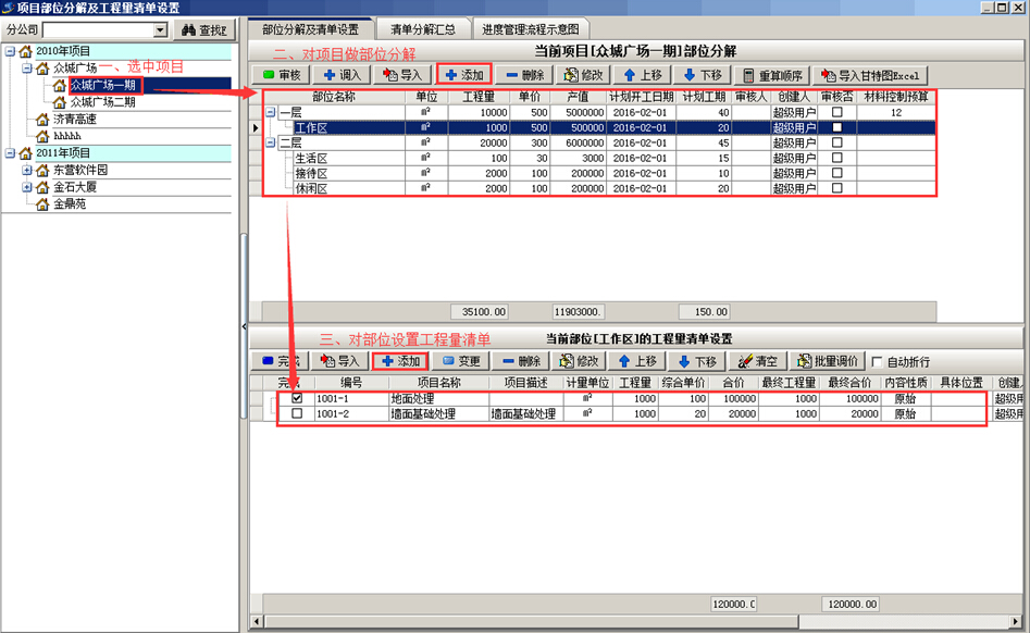 在《金石工程項目管理軟件》中,進入導航【工程管理】->【部位分解及工程量清單設置】進行分解操作,如下圖: