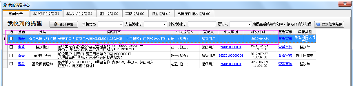 應(yīng)用場(chǎng)景:施工企業(yè)跟甲方簽訂承包合同時(shí)一般會(huì)約定好付款周期及付款比例,金石軟件專(zhuān)門(mén)開(kāi)發(fā)了設(shè)置收款計(jì)劃模塊,收款計(jì)劃到期后系統(tǒng)會(huì)發(fā)送提醒給相關(guān)提醒人。