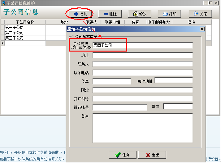 金石工程管理軟件中首先維護子公司名稱,打開菜單欄----系統----子公司信息維護