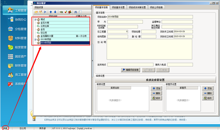 工程管理軟件中設置完成之后,重新登錄陳勝的賬戶,查看該員工的項目權限,項目維護中顯示的項目只有金石大樓這個項目