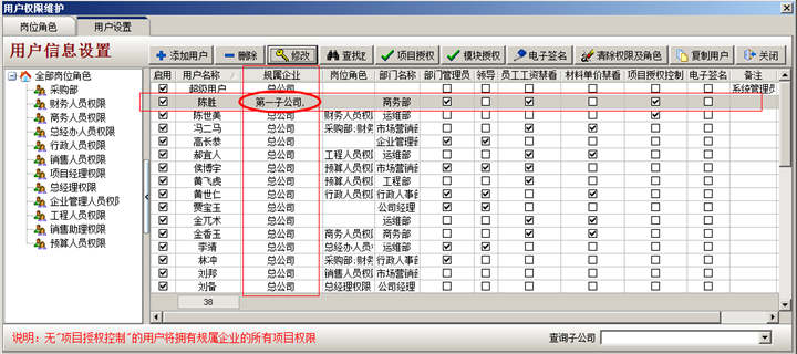 3.工程管理軟件中設置子公司員工:以員工陳勝為例講解,登錄超級用戶----系統維護----用戶管理權限設置。選中員工陳勝,點修改按鈕