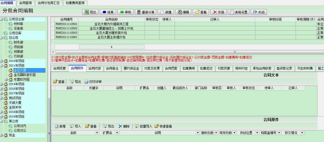 在【合同編輯】中左半部分是合同的分類,分包合同也是按【項目維護】進行分類管理的。一個項目下可以建立多個合同,窗口的右上部分是合同列表,一行信息代表一個合同。右下部位是當前合同相關的內容:【合同附件】、【合同內容】、【合同備注】、【履約保證金】、【合同提醒】、【合同付款及相關發票】、【合同罰款】、【扣繳費用】、【合同材料約定】、【資質管理】、【合同借閱】。