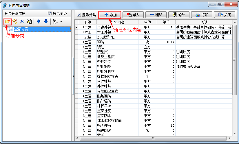 在做工程項目分包管理之前要做好往來單位維護,人工工種維護,分包內(nèi)容維護,罰款分類維護,分包預算單維護。1.往來單位維護
