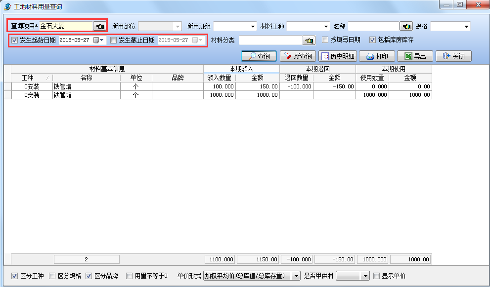 當單價形式設置為【最后一次采購價】進行查詢時,可以得出當前項目材料的庫存總值,如下圖: