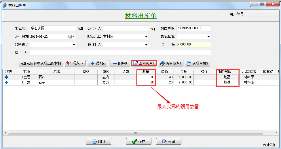 【材料出庫單】是在工地現場材料管理過程中,需要不斷從倉庫中領取材料供工地工人使用,【材料出庫單】是在工地現場材料管理中記錄了材料的領用過程。通過該單據,相關人員可以清楚地掌握各工程的材料使用狀況以及各種材料的庫存情況。錄入本單據前,需先錄入要用到【材料維護】、【項目維護】(包括【庫房信息】、【領料班組信息】)。