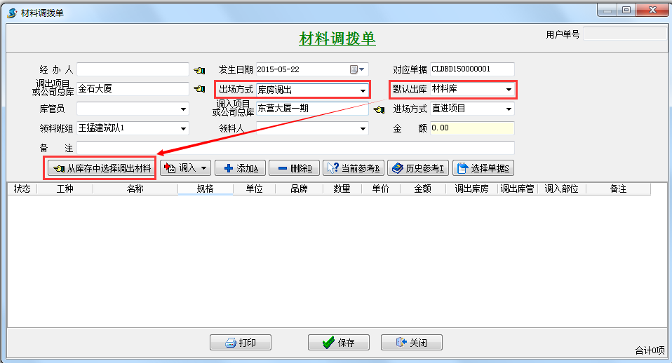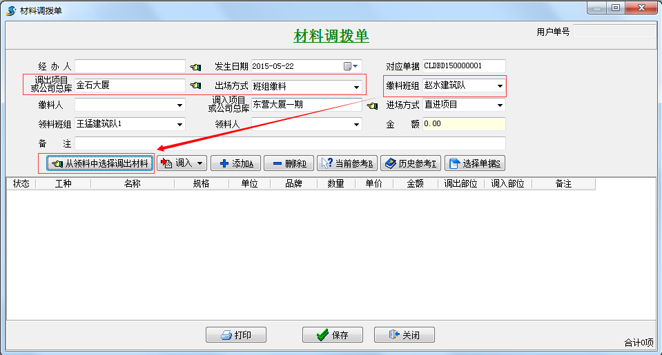 點擊主菜單【材料】->【材料調撥單】->【新建】打開界面如下