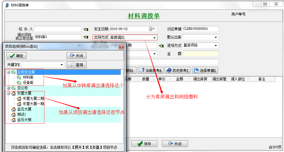 【材料調撥單】是當施工企業在工地現場材料管理中承接多項工程時,可能會需要把為某一工程購買的材料調撥給另一工程使用,將本公司的材料中轉庫的材料發到項目上,此時應填寫【材料調撥】單。錄入本單據前, 需先錄入要用到基礎信息中的【材料維護】、【項目維護】(包括【庫房信息】、【領料班組信息】)。