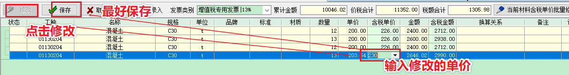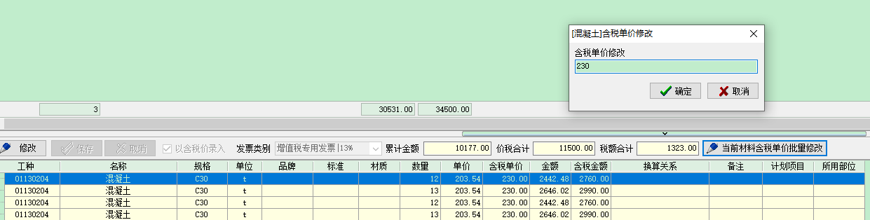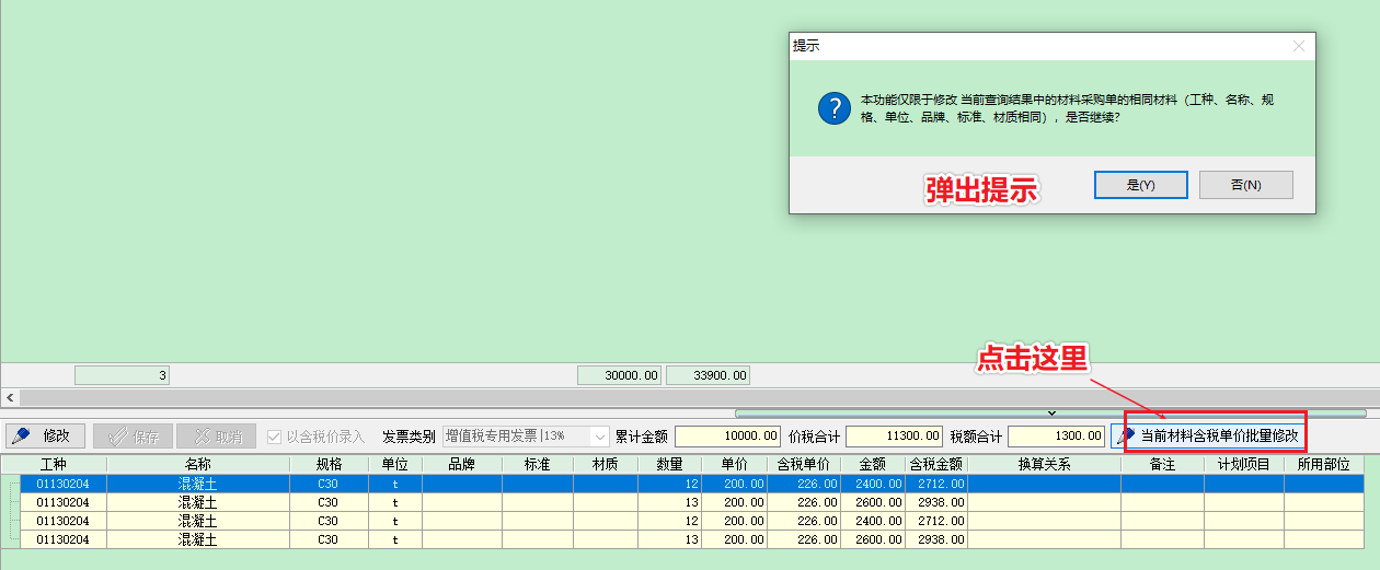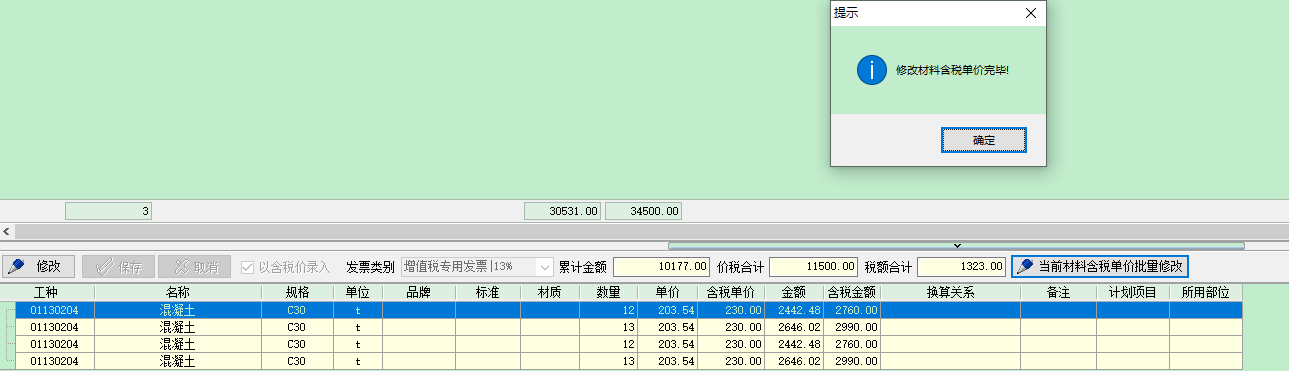 2 批量修改(適用于材料名稱規格單位品牌標準材質完全一致的情況)