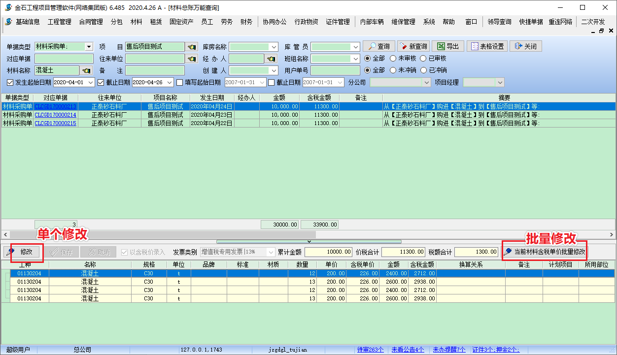 場景描述:項目上的部分材料市場價格波動較頻繁,一般是按時間段結算一次(比如一個月),月底確定材料價格,這樣在入庫時材料單價可以不寫,直接入庫,在月底時統一修改單價。