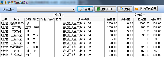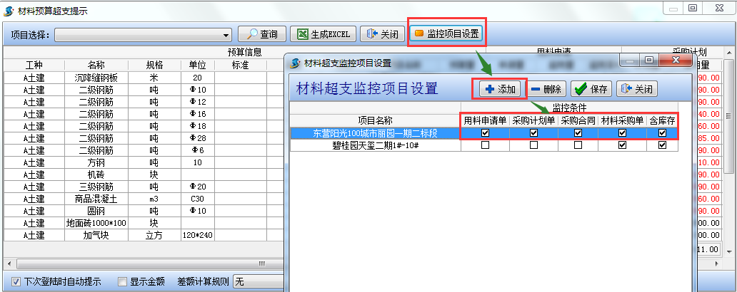 新版本中的預算超支提示可按不同項目分別設置預算與“材料管理”中一系列的單據進行對比如下圖:預算量分別對比 “用料申請單” “采購計劃單” “采購合同” “材料采購單” 是否包含“庫存” (老版本中只有兩量對比且不能按項目區(qū)分設置)