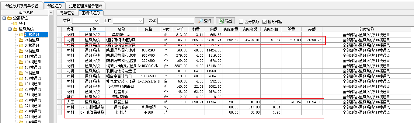 通過部位匯總這個界面,我們可以看到材料預(yù)算與實際用量的對比以及預(yù)算金額與實際金額的對比,便于實時掌控成本的發(fā)生或超預(yù)算、超預(yù)算金額的情況。