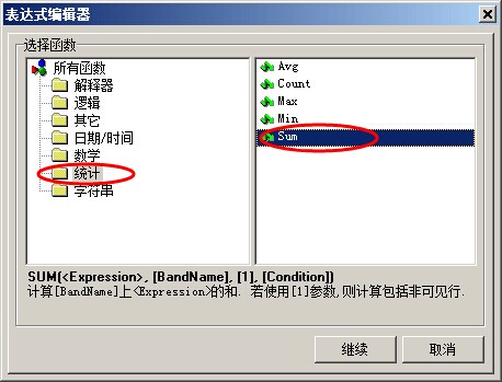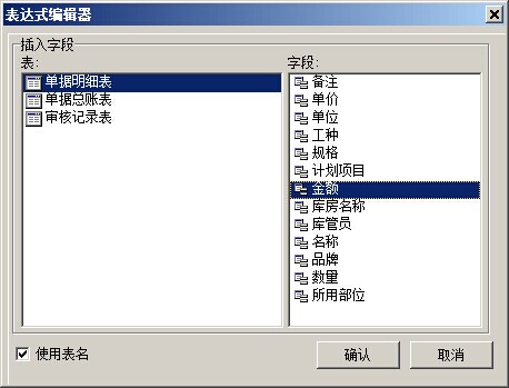 選擇好,之后點擊確定,就會依次保存各個選擇框,最終結果:[Sum([單據明細表."金額"],,,)]