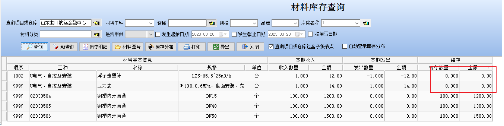 最后點(diǎn)擊保存按鈕,此時(shí)我們?cè)偃?kù)存查詢中查看結(jié)余情況,如下圖所示,會(huì)發(fā)票金額歸零。