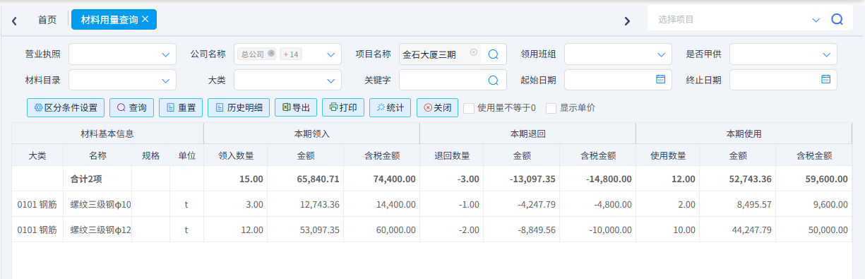 是用于查詢工地材料用量。可以按照營(yíng)業(yè)執(zhí)照、公司、項(xiàng)目、班組、材料名稱、時(shí)間等篩選材料用量信息