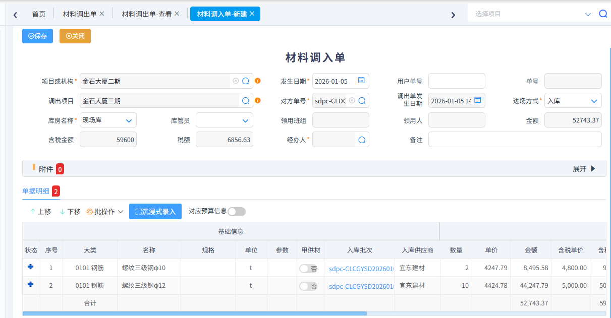 項(xiàng)目與項(xiàng)目或者公司總庫(kù)與項(xiàng)目之間調(diào)撥材料時(shí)由調(diào)出方填寫材料調(diào)出單,收入方填寫材料調(diào)入單,其中調(diào)入單必須根據(jù)材料調(diào)出單生成,調(diào)出單含稅金額會(huì)產(chǎn)生雙方的應(yīng)收應(yīng)付,后期可使用內(nèi)部資金劃轉(zhuǎn)單進(jìn)行資金支付。 材料調(diào)出單中發(fā)票類別選了帶稅率的類型,稅金也能調(diào)撥,為后續(xù)項(xiàng)目稅金月結(jié)單使用。