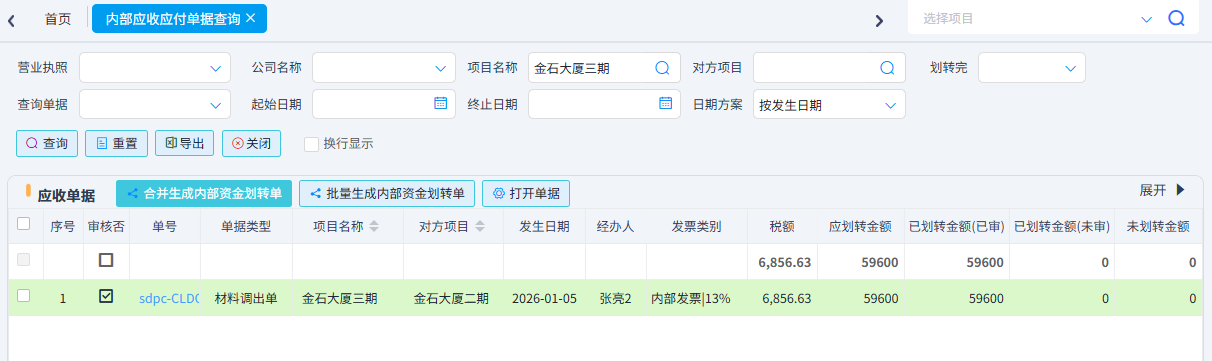 調(diào)出單含稅金額會(huì)產(chǎn)生雙方的應(yīng)收應(yīng)付,后期可使用內(nèi)部資金劃轉(zhuǎn)單進(jìn)行資金支付