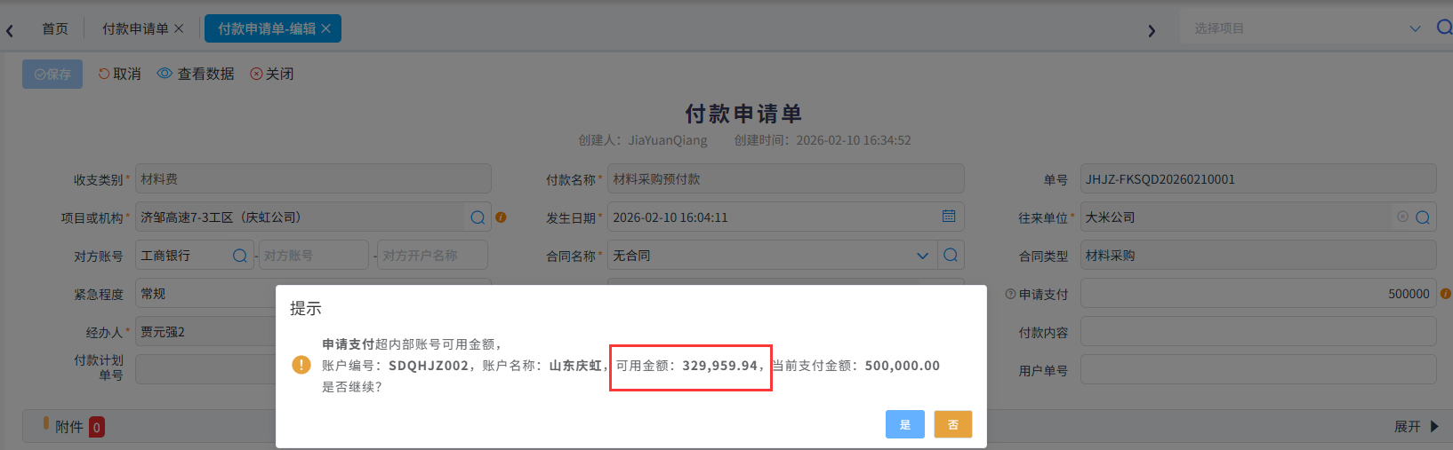 【付款申請單】超項目資金余額、內部賬戶金額預警提示,避免超項目的資金賬戶余額不足時,仍提交付款申請并完成支付,防止出現資金透支、違規墊付等問題,保障資金安全。