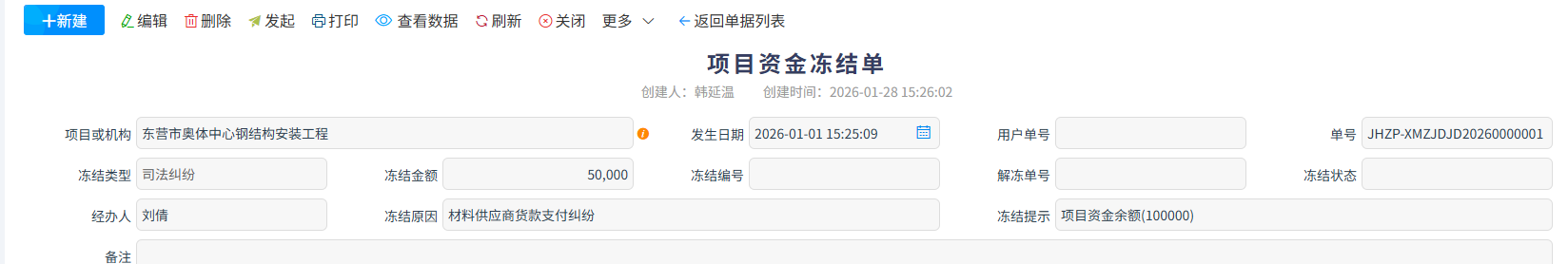 項目資金解凍單是配套【項目資金凍結單】的風控單據,用于對已凍結的項目資金發起解凍申請、完成審批流程并留存正式記錄,核心是按規解除資金的支取與流轉限制,讓凍結資金恢復正常使用狀態。
