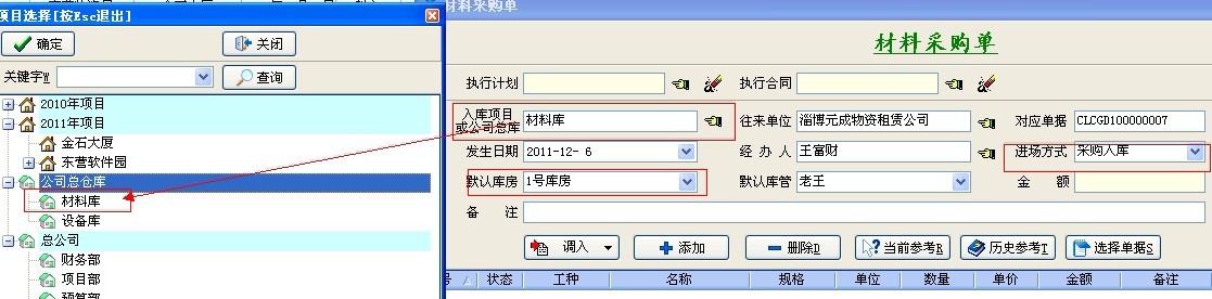 注:材料入場方式一般分為三種:1.材料入項目庫房、2.材料入公司總庫、3.材料直進項目 如下圖: