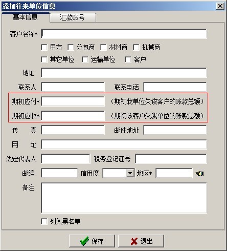 其中在往來單位維護中可以設置期初應付應收賬款。如下圖: