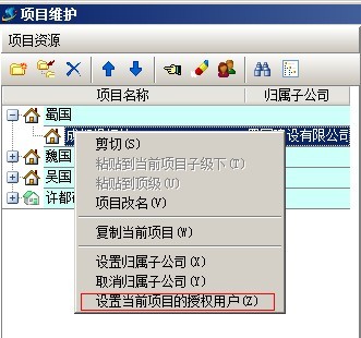 C:項(xiàng)目授權(quán)判斷,是指判斷該用戶是否有項(xiàng)目授權(quán),在系統(tǒng)維護(hù)模塊中【用戶管理權(quán)限設(shè)置】和項(xiàng)目維護(hù)中都可以進(jìn)行設(shè)置用戶項(xiàng)目授權(quán)。設(shè)置方法如下圖: