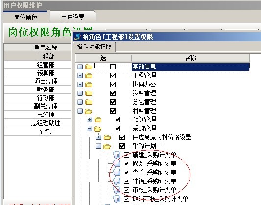 A:模塊授權(quán)判斷,是指用戶針對(duì)相關(guān)業(yè)務(wù)單據(jù)所擁有的基礎(chǔ)操作授權(quán),如:業(yè)務(wù)單據(jù)的新建、修改、刪除、查看等。是在系統(tǒng)維護(hù)模塊中【用戶管理權(quán)限設(shè)置】進(jìn)行設(shè)置,只要給先做好【崗位角色】授權(quán),然后給用戶選擇相應(yīng)崗位即可。如下圖: