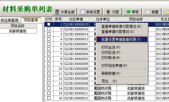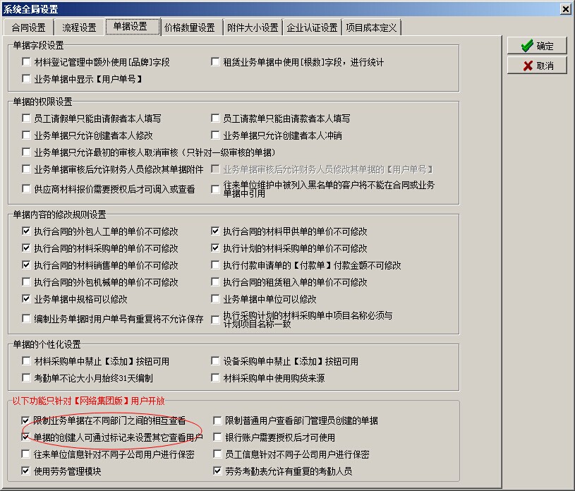在工程項(xiàng)目管理軟件(集團(tuán)版)中,存在一些設(shè)置(開關(guān)),使業(yè)務(wù)單據(jù)的訪問(wèn)存在一定限制,只有在滿足條件的。用戶才能查看到該業(yè)務(wù)單據(jù)。如下圖: