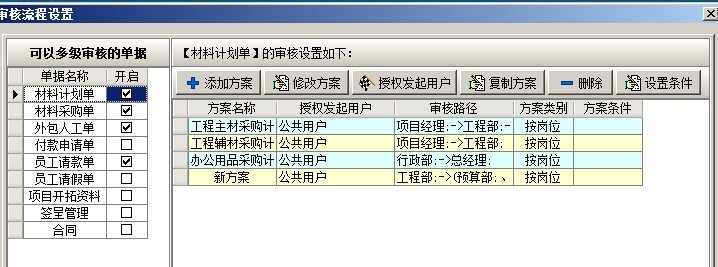 6. 業(yè)務(wù)單據(jù)是多級(jí)審核,審核流程中的待審核用戶不受限制。審核流程設(shè)置是在系統(tǒng)維護(hù)模塊,【審核流程設(shè)置】中進(jìn)行設(shè)置。如下圖:左側(cè)是單據(jù)名稱列表,右側(cè)是單據(jù)審核的各種方案。