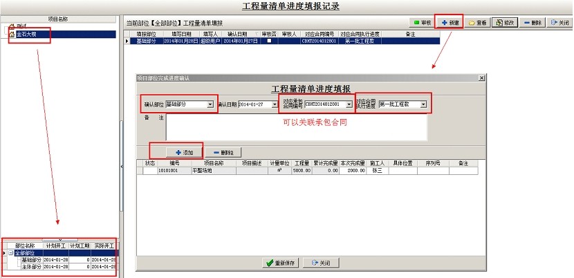 選中相應的項目,點擊新建,填出工程量進度填報窗口,選擇部位名稱,可以選擇關聯項目對應的承包合同號和承包合同執行進度,然后點添加,調入清單內容,在本次完成量處輸入已完成的工作量,不限制錄入進度填報,直至清單工作量完成,調入下一項清單內容(如某項清單實際工程量超過清單預算量,可以繼續填報)
